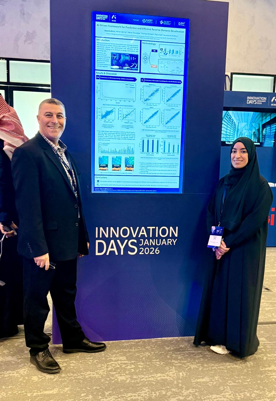 Throughout the event, Prof. Noreddine Ghaffour, Group Leader of DESAL, engaged in technical discussions with ACWA Power teams and other leading water companies, focusing on deployment pathways and scale-up considerations. In parallel, Najat Amin, a member of the DESAL research team, presented ongoing results through a poster titled “AI-Driven Framework for Predictive and Efficient Reverse Osmosis Desalination,” sharing insights from the current R&D work.